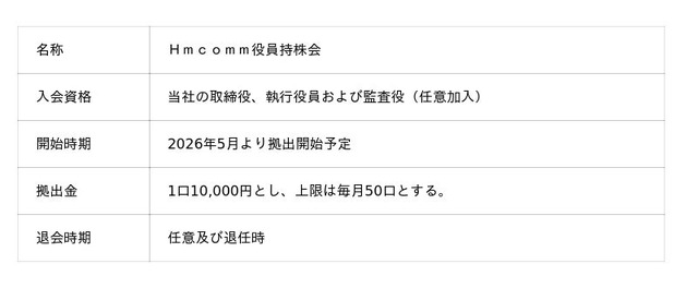 当社は、2025年12月に従業員持株会を設立しておりましたが、今般、当社の役員等においても役員持株会を設立することといたしました。本制度は、役員自らが当社株式の購入に際してのインサイダー取引の懸念を回避し、当社株式を継続的に取得・保有することで、株主の皆様と株主価値をより一層共有し、更なる企業価値の向上を図ることを目的としております。