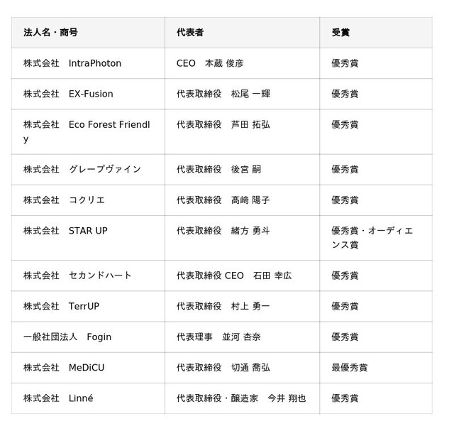 - 受賞者数:11社(最優秀賞1社、優秀賞10社(内、オーディエンス賞1社含む))
