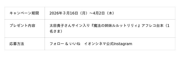 全国に「イオンシネマ」98劇場を運営するイオンエンターテイメント株式会社(本社:東京都港区、代表取締役社長 藤原信幸)は、TVアニメ『魔法の姉妹ルルットリリィ』の放映開始に先駆け、イオンシネマ10劇場で2026年3月20日(金・祝)より先行上映を実施いたします。また、上映を記念して、3月下旬より順次『魔法の姉妹ルルットリリィ』のイオンシネマオリジナルグッズを全劇場のグッズ売場で販売予定です。