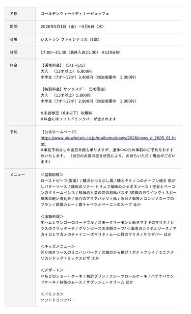 舞浜ビューホテル by HULIC(所在地:千葉県浦安市、総支配人:鈴木裕樹、運営:ヒューリックホテルマネジメント株式会社)は、2026年5月1日(金)から5月6日(水)までのゴールデンウィーク期間中、1階「レストラン ファインテラス」にて、初夏の訪れを祝う「ゴールデンウィークディナービュッフェ」を開催いたします。