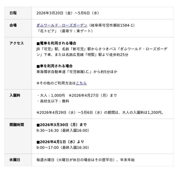 園内の広大な敷地内にある「花トピア」にて、第16回コンテストの優秀作品20点を展示します。世界中の子どもたちが自然や生きものをしっかりと見つめ、真剣な思いを込めて描いた作品は、どれも魅力あふれるものばかりです。また、国や地域、年齢、表現方法など、作品一つひとつに個性が光ります。会場となるぎふワールド・ローズガーデン(岐阜県可児市)には、国内外の多彩な品種のバラがおよそ6,000品種、20,000株植栽されています。また、ネモフィラやひまわりなど四季折々の花を堪能できるだけなく、大型複合遊具をはじめ親子で楽しめる施設も豊富です。