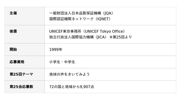 「JQA地球環境世界児童画コンテスト」は、子どもたちに絵を描くことを通じて環境問題について考える機会を提供することを目的に、UNICEF東京事務所(東京都渋谷区)と独立行政法人国際協力機構(東京都千代田区、略称:JICA)の後援(※)のもと1999年より毎年開催しています。また、国内の美術館などで展示会を開催し、多くの人たちに子どもたちの地球環境へのメッセージを伝えています。※JICAの後援は第25回より