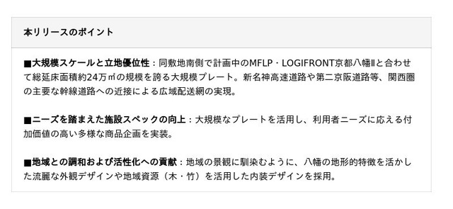 なお、本施設に続き2026年10月(予定)には、同敷地内南側に「MFLP・LOGIFRONT京都八幡II」(地上4階建・ダブルランプ、敷地面積:約78,815平方メートル 、延床面積:約161,488平方メートル )(以下、「本施設2」という。「本施設1」および「本施設2」を総称して「本施設」という。)の着工を予定しており、2棟合わせた総延床面積は24万平方メートル を超える大規模物流拠点となります。