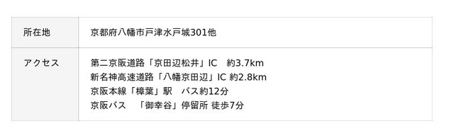 本施設は京都・大阪・神戸を結ぶ要衝に立地し、関西全域の広域配送を担う物流拠点です。第二京阪道路「京田辺松井」ICから約3.7km、新名神高速道路「八幡京田辺」ICから約2.8kmの好立地に加え、将来的な新名神高速道路全線開通による名古屋や神戸へのアクセス性向上も予定しており、関西における東西ハブ拠点として、より一層重要な役割が期待されます。