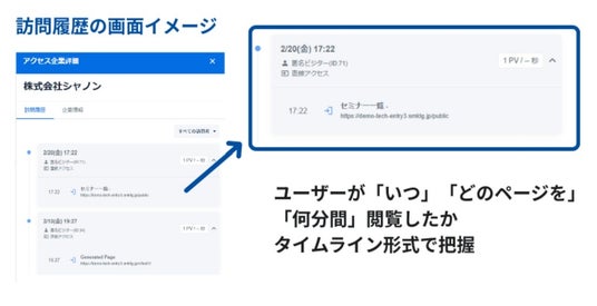 特定企業のユーザーが「いつ」「どのページを」「どの程度閲覧したか」といった行動ログをタイムライン形式で確認することができます。