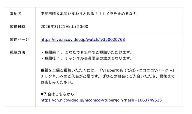 本企画は、VTuberと視聴者が一緒に映画を観ながらリアルタイムで感想を共有できる映画上映番組です。ニコニコのコメント機能を通じて、推しVTuberと一体感のある映画体験をお楽しみいただけます。