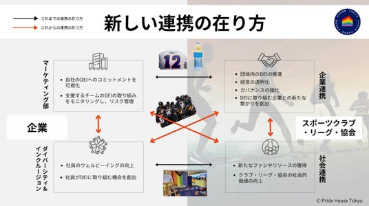 このような状況のなか、スポーツ分野のインクルーシブとクラブ・リーグ・企業の持続可能な発展に向け、スポーツ業界の新たなDEI指標として「スポーツ版PRIDE指標(仮称)」の開発が2024年11月に発表されました。本指標は、スポーツクラブ・リーグ・協会と、その活動を支えるスポンサー企業との新しい連携スタイルを提案するもの。双方が組織全体を通じて横断的に連携することでDEIが可視化され、協賛先のリスク管理や、行政と連携した新規事業開発にも資する指標になることが見込まれます。また、日本人口の約8%を占めるといわれるLGBTQ+のスポーツ分野への積極的な参加を促すことで、競技人口の増加だけでなく、ファンやスポンサーの多様化および増加、クラブと企業・地域との関係強化といったさまざまなメリットが期待できます。