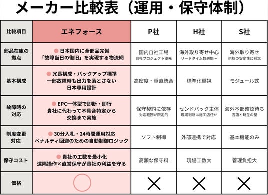 エネフォースは、PCSを分散配置し、バックアップシステムを標準装備。さらに、万一の際も 48時間以内に現場へ急行する保守体制を完備。止めない、壊れない、そしてすぐに直る。これがエネフォースの選ばれる理由です。