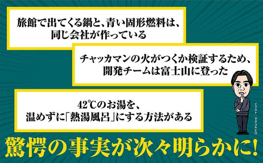 「旅館で出てくる鍋と、青い固形燃料は同じ会社が作っている」「チャッカマンの火がつくか検証するため開発チームは富士山に登った」「42℃のお湯を温めずに「熱湯風呂」にする方法がある」「お菓子に入っている「たべられません」の袋は、開けた時点で役目を終えている」など、