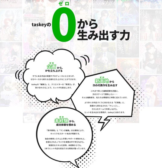 本特設サイトでは、「0(ゼロ)から、最高傑作を。」をテーマに、編集者100人採用を掲げた背景や目指す未来の姿、0から作品を生み出すtaskeyの制作体制などをまとめています。