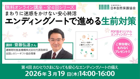 公益財団法人日本自然保護協会(理事長:土屋俊幸)では2026年3月19日(木)に、第4回「エンディングノートで進める生前対策 オンライン講座」を開催します。