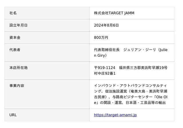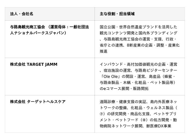 与路島観光商工協会・TARGET JAMM・ターゲットヘルスケアの3者は本提携を基盤として、与路島を「日本の離島活性化モデル」として確立することを目指します。鹿児島県をはじめとする行政機関、国土交通省観光庁・環境省・農林水産省等の関係省庁、そして地域住民・漁業者・農業者とともに、持続可能な地域経済の好循環を構築してまいります。与路島での成果をもとに全国の離島・過疎地域への展開可能なモデルの構築も視野に入れ、日本の地方創生に広く貢献することを目指します。■ 各法人・各社概要