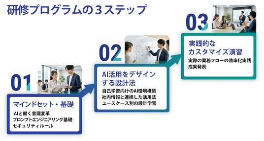 本研修は、現場のDX推進を担う「自走型AI人材」へ導く3ステップで構成されています。