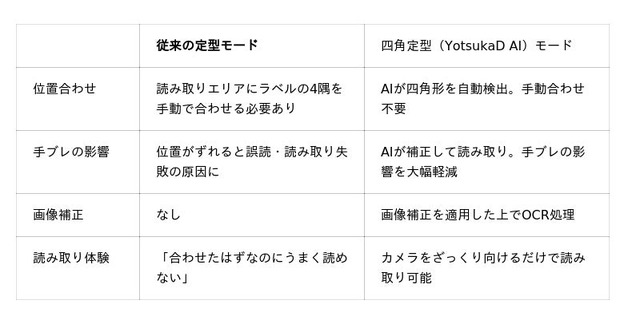 こうした現場転記作業の自動化手段としてOCRの活用が広がる一方、i-Repo EdgeOCRでは、ラベルなどの定型フォーマットを読み取る機能として、「定型読み取りモード」 を提供しておりましたが、読み取り対象に対してカメラを正確に合わせる操作が求められていました。手ブレや角度のずれによって読み取りがうまくいかないケースが多く、現場での継続的な利用を妨げる要因となっていました。この課題に応えるため、エッジAIによる自動認識を活用した「四角定型(YotsukaD AI)モード」を開発しました。四角定型(YotsukaD AI)モードについて