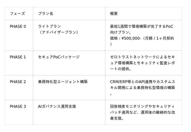本サービスでは、環境構築からセキュリティ対策、運用支援までをワンストップで提供し、企業の安全なAIエージェント導入を強力にサポートします。