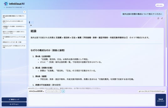 散在する社内マニュアル、手順書、設計書、議事録などを、「InfiniCloud(R) AI パッケージ」が横断的に理解し、自然文で質問できるナレッジ検索として活用できます。