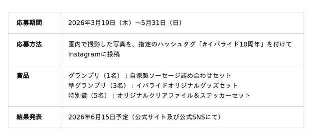 リニューアルオープンより10周年を記念し、2026年3月19日(木)より、来園者参加型の10周年記念フォトコンテストを開催いたします。題して「はじける笑顔!イバフォトコンテスト」。園内には花畑やフォトスポットも充実し、ご家族やご友人との特別な瞬間を写真に残していただけます。本コンテストでは、イバライドで撮影された思い出のお写真を募集し、優秀作品には自家製ソーセージセットなど豪華賞品を贈呈いたします。