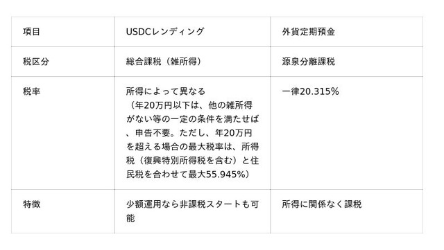 銀行の外貨預金の利息は、所得に関係なく一律20.315%の源泉分離課税ですが、USDCレンディングの収益は雑所得として総合課税扱いとなります。USDCレンディング1回募集あたりの応募上限額は5,000USDCになりますので、他の雑所得ががない等の一定の条件を満たせば、年間の雑所得額が20万円以下に抑えられることから、課税対象外になります。「まずは少額からはじめたい」「初めて米ドル建資産運用をする」方にもぴったりです。