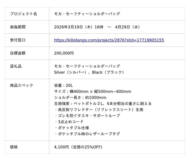 日常×アクティブをデザインするライフスタイルブランド「moca(モカ)」を運営する株式会社モート商品デザイン(本社・大阪市西区、代表:正田勝之)は、360°全方向高反射リフレクター素材を採用した新しいバッグ「モカ・ セーフティーショルダーバッグ」を一般販売に先駆けて、クラウドファンディング型ECサービス Kibidango(きびだんご) にて販売をスタート。