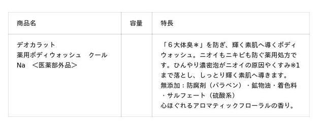 『デオカラット』では、これまでの5大体臭ブロック-汗臭・大人臭※2・ストレス臭※2・疲労臭※2・皮脂臭※2-に寝不足臭※2を加え、6大体臭*ブロックへとパワーアップした「薬用ボディウォッシュ」を2026年2月に発売しました。「薬用ボディウォッシュ クール」は、その6大体臭*ブロックに加え、冷感成分※3を配合し、ひんやりすっきりした感触で、汗ばむベタついた肌を爽快に洗い上げる数量限定品になります。「薬用ボディウォッシュ」同様、ベチバー・パチュリを含む高機能天然香料が嫌なニオイをマスキングし、ニオイの発生を防ぐ殺菌有効成分※4が気になる背中ニキビを防ぎます。うるおい成分であるCICA成分GL※5・ヒアルロン酸・コラーゲン・緑茶エキス・オウゴンエキスGL(保湿)も配合し、きめ細かく弾力のある濃密泡がくすみ※1をケア、しっとり輝く肌に導きます。