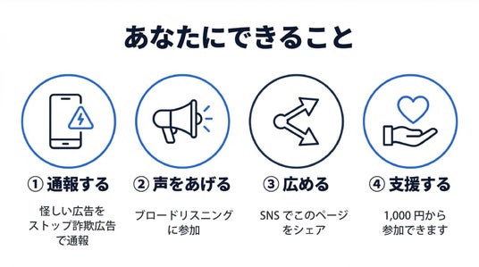 広める:このプレスリリースやプロジェクトの情報をSNSでシェアしてください。一人でも多くの人がこの問題を知ることが、被害を減らす第一歩です。シェアの際はぜひ #ストップ詐欺広告 をつけてください。
