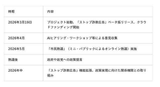 本プロジェクトの実現に向け、DD2030は2026年3月よりクラウドファンディングを開始します(目標金額:500万円)。調達した資金は、ストップ詐欺広告の開発費用、市民熟議の実施費用、および広報・世論喚起活動に充当します。本クラウドファンディングは寄付型であり、リターン品の設定はありません。クラウドファンディングページ:https://camp-fire.jp/projects/930941/