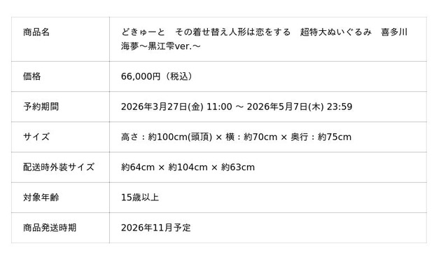 高さ約100cm・幅約70cmの超特大サイズで存在感はバツグンです。“どきゅーと”の愛らしいデザインで、ますますキュートになった、超ド級の『喜多川海夢(黒江雫 ver.)』をぜひあなたのそばにお迎えください。