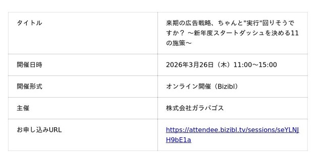 AIを活用した広告クリエイティブ制作・運用サービス「AIR Design」を展開する株式会社ガラパゴス(本社:東京都千代田区、代表取締役:中平健太)は、2026年3月26日(木)にオンラインカンファレンス「来期の広告戦略、ちゃんと"実行"回りそうですか? ~新年度スタートダッシュを決める11の施策~」を主催することをお知らせいたします。