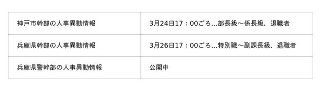 株式会社神戸新聞社(本社:兵庫県神戸市)は、同社のニュースサイト「神戸新聞NEXT」において、神戸市の市幹部職員および兵庫県の県幹部職員の人事異動情報を検索できるサービスを今年も公開します。