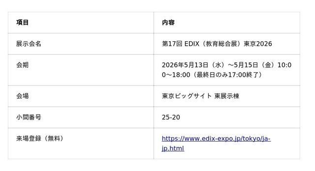 日本最大級のメタバースプラットフォーム「cluster」を運営するクラスター株式会社(本社:東京都品川区、代表取締役CEO:加藤直人)は、2026年5月13日(水)から15日(金)まで東京ビッグサイトで開催される「第17回 EDIX(教育総合展)東京2026」に出展いたします。
