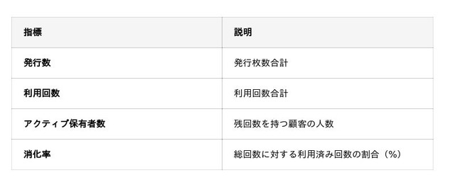 回数券ごとの発行数・利用回数・アクティブ保有者数・残回数・消化率をプログレスバー付きで一覧表示。
