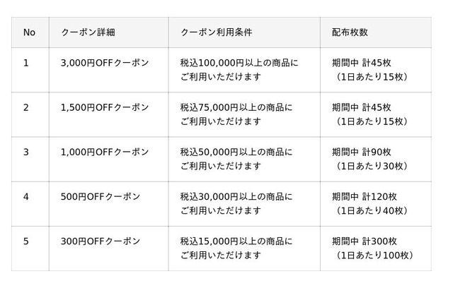 以下、開催期間中のクーポン詳細や利用条件・配布枚数になります。