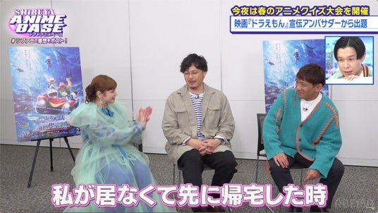 番組中盤では、現在大ヒット上映中の『映画ドラえもん 新・のび太の海底鬼岩城』を大特集。宣伝アンバサダーを務める平愛梨、アルコ&ピース(平子祐希、酒井健太)からのVTRクイズが出題されました。平愛梨からの「私が一番好きなひみつ道具は何でしょう?」という問題の正解は「スケスケ望遠鏡」。その理由について平が、「子どもたちが見えない空間でどうやって授業を受けてるのかとか、時に夫(プロサッカー選手・長友佑都)が、私が居なくて先に帰宅した時、何をしているのか(笑)」と、家族のプライベートを監視したいという斜め上すぎる願望を明かすと、すかさずアルコ&ピースの2人から「落ち着かねえな!」とツッコミが入り、笑いを誘いました。