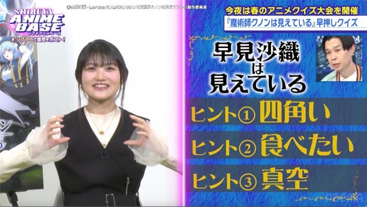 番組冒頭、本クイズ大会の“実行委員長”として、アニメ『魔術師クノンは見えている』でクノン・グリオン役を務める声優・早見沙織がVTRで登場し、大会が華々しくスタート。さっそく早見から「クノンが最もよく使う水魔術の名前は?」という難問が出され、正解である「ア・オリ」を誰も導き出せず、スタジオは初回から大苦戦。しかし、正解者には豪華賞品「高級いちご(クイーンズストロベリー)」が用意されていることが発表されると、スタジオの熱気は一気に高まりました。