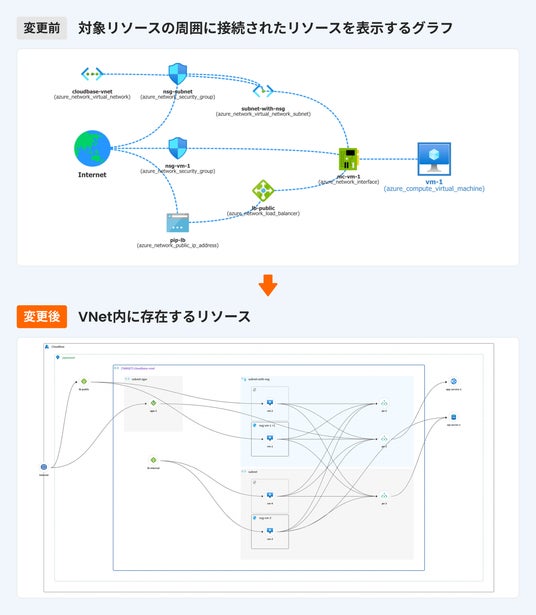本機能により、VNet内のリソース構成および関連サービスとの接続関係をグラフ形式で俯瞰できるようになり、クラウド環境の構成理解を支援します。また、セキュリティ担当者やクラウド運用担当者が、ネットワーク構成やリソースの配置状況を迅速に確認できるようになることで、設定ミスの発見やセキュリティリスクの把握、インシデント発生時の調査効率の向上が期待されます。