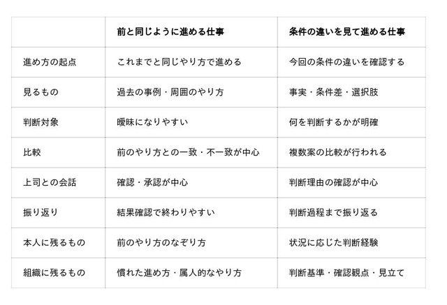 - あなたの職場の仕事は、どちらに近いですか?:一見似ていても異なる2つの仕事の進め方を比較し、「判断が育つ仕事」の条件を見直すための実務資料