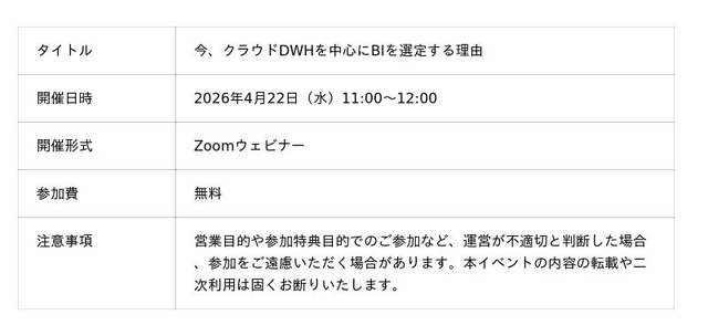 INSIGHT LAB株式会社(本社:東京都新宿区、代表取締役社長 CEO:遠山 功、以下「当社」)は、 2026年4月22日(水)に、無料オンラインセミナー【今、クラウドDWHを中心にBIを選定する理由】を開催します。