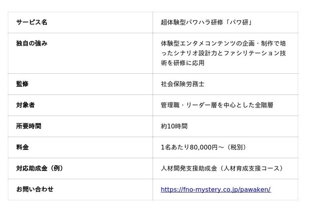 株式会社これからミステリー(本社:東京都渋谷区、代表:飯田祐基)は、改正労働施策総合推進法(パワハラ防止法)への対応を目的とした管理職向け体験型ハラスメント防止研修サービス「超体験型パワハラ研修(通称:パワ研)」の提供を開始いたしました。