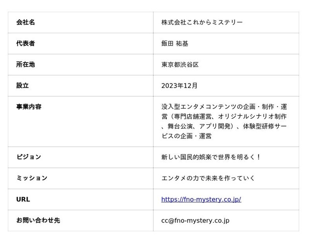 株式会社これからミステリーは、「新しい国民的娯楽で世界を明るく!」をビジョンに掲げ、マーダーミステリー(以下:マダミス)の企画・制作・運営を行うエンターテインメント企業です。270度プロジェクションマッピングを導入したマダミス専門店舗の運営、オリジナルシナリオの制作、舞台公演の企画など、「参加者を物語の当事者にする」体験設計を事業の中核としてきました。