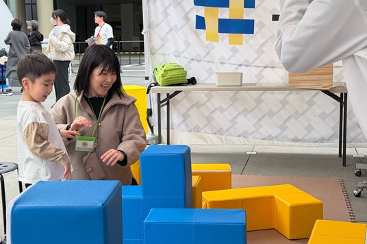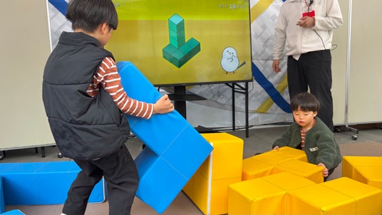 番組カラーである黄色と青のブロックを用い、来場者は親子や友達同士で協力しながら、イラストの形に合わせてブロックを積み上げます。体を動かしながら試行錯誤を重ねることで、自然と“ひらめき”を引き出す設計となっています。