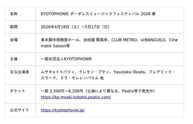 公式ウェブサイト:KYOTOPHONIE(https://kyotophonie.jp/ )公演に関する問い合わせ先:京都公演に関するお問い合わせは、こちらまでご連絡ください。