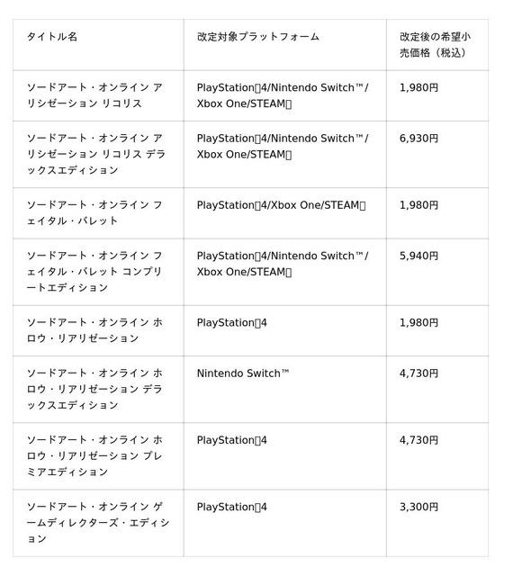 ■SAO家庭用ゲームシリーズの一部商品がお得に購入できるセール&価格改定のお知らせ
