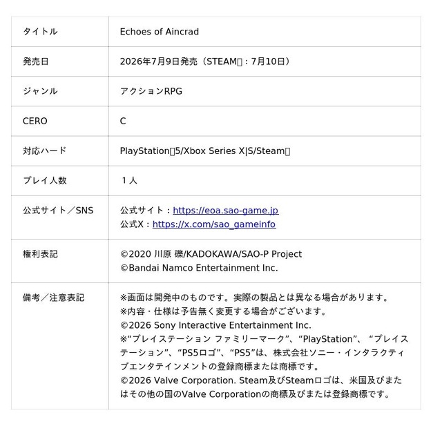 ◇『Echoes of Aincrad』公式サイト: https://eoa.sao-game.jp/