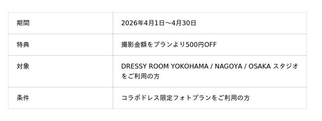 セルフ写真館 PICmiiは、カメラ専門店「カメラのキタムラ」のグループ会社として、撮影画質の仕上がりにこだわったセルフ写真館で、個室での自由な撮影をお楽しみいただけます。DRESSY ROOM YOKOHAMA/NAGOYA/OSAKAスタジオでは、4月限定で『新しい私、春のドレス割』を実施。4/1~4/30の期間、コラボドレス限定フォトプランをご利用の方にご利用料金より500円OFFとさせていただきます。(記事を見た旨をお伝え下さい。)