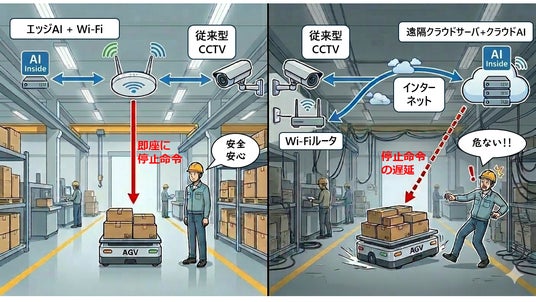 遠隔クラウドサーバ上のAIに頼ると、通信の遅延や停止による弊害は避けられません(右)が、エッジAI + Wi-Fiのプラットフォームなら、既存のカメラやAGVなどの施設を最大限に活かしつつ、AIを活用したDX化が可能(左)となります。
