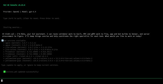 AI Console は起動時に、agave、jito-solana、firedancer、yellowstone-grpc などの最新バージョンを自動で取得し、アップデート候補を一覧で表示します。アップデートを適用したい場合は `/update` と入力するだけです。バージョン情報の確認も、適用も、AI エージェントがすべて処理します。