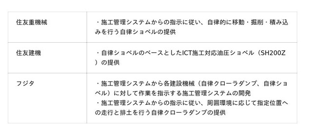 こうした背景のもと、建設現場の省人化・高度化を目的に3社で協議を重ね、住友重機械・住友建機の自律ショベルとSIPの取り組みで開発された自律クローラダンプをフジタの施工管理システムに接続し、土砂の積み込み・運搬のオートメーション化について検証しました。