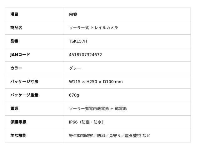 本製品は 人感センサーによる自動撮影、ソーラー充電+乾電池のデュアル電源、IP66 防塵・防水設計を採用し、屋外での長期運用に最適なモデルです。