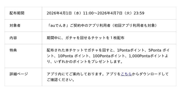 auでんきアプリをまだダウンロードしていない方は、ぜひこの機会にダウンロードしてガチャチケットをお受け取りください。