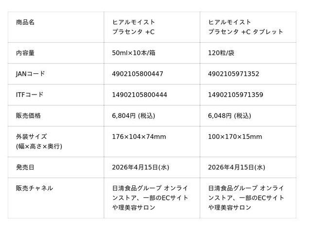 「ヒアルモイスト発酵液」は、甘さを抑えて毎日続けやすい味わいに仕上げるとともに、従来品と比較してカロリーを40%オフしました。「ヒアルモイストW」は、ヒアルモイスト乳酸菌末の量を10%アップしました。「ヒアルモイスト プラセンタ +C」は、ヒアルモイスト乳酸菌末の量を10%アップするとともに、プラセンタ特有の苦みやエグみを抑え、毎日続けやすいコクのある甘さのマスカット味に仕上げました。これらのドリンクタイプ3品は、リニューアルに伴い価格を改定します。